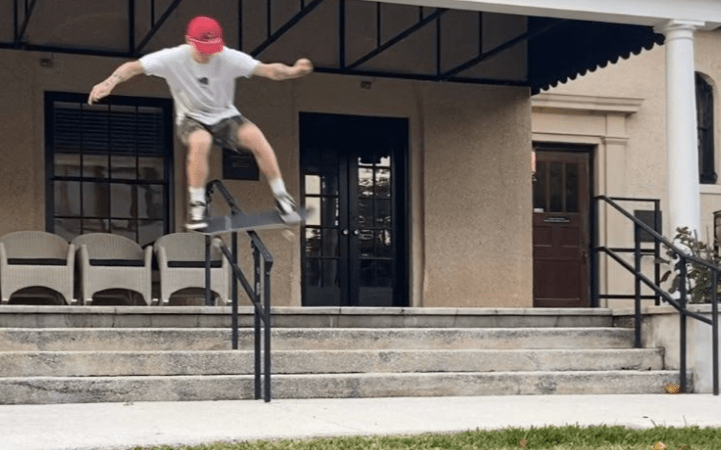 (Canon Crovo) Canon Crovo performing a frontside boardslide in the historic City of St. Augustine Fla.. This pandemic leaves many skateboarders the opportunity to skateboard where they once could not