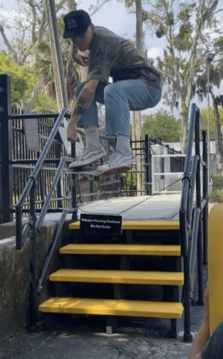 (Canon Crovo) Canon performing an ollie over a rail in St. Augustine Fla.. As many people are reacting differently to COVID-19, skateboarders are taking a different approach and looking looking for creative ways to stay healthy and social distance.