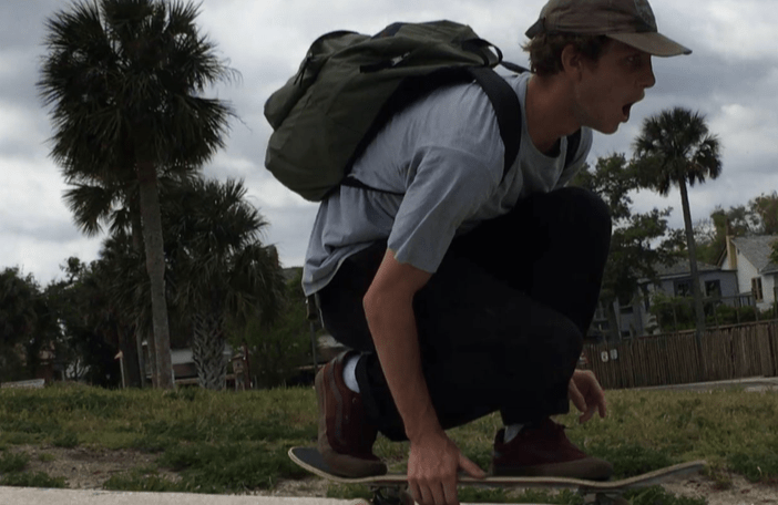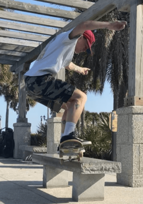 (Canon Crovo) Canon cutting through a crooked grind on a waterside bench, near the Bridge of Lions, in St. Augustine Fla.. With only locals, traveling through downtown, many reactions are only positive towards the skateboarders.