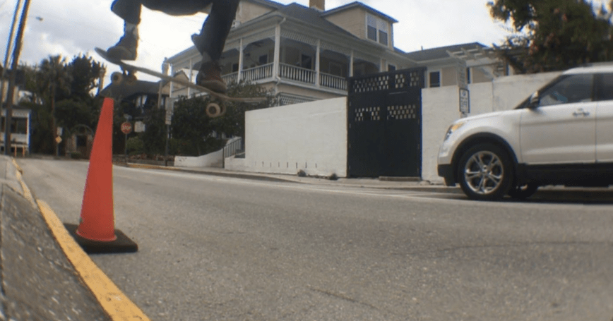 (Cameron Hammer) Cameron Hammer, relaxed more than ever, soaring over a traffic cone in St. Augustine Fla.. COVID-19 has given the opportunity, to skateboarders all over the country, to skateboard in places that they once could not.