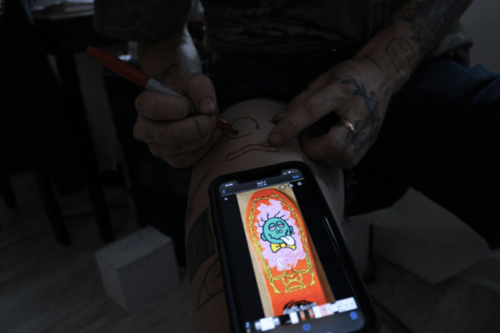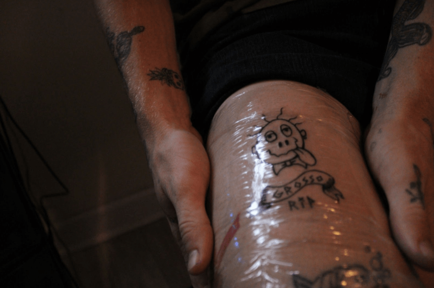 (Canon Crovo) Canon wraps his thigh in plastic to preserve the fresh ink on the raw skin. “In the future, I hope to someday be able to make money to exist by making my own art, filming or being creative,” he said.