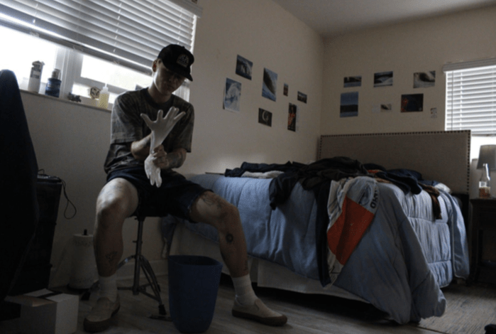 (Canon Crovo) Canon preparing to give himself a tattoo by putting on gloves to stay sanitary. Canon is able to find inspiration for his art and creativity through various artists. “Music like Miles Davis, the chaos that he does, his jazz is unprecedented, really anything that just makes your heart beat fast,” Canon said.
