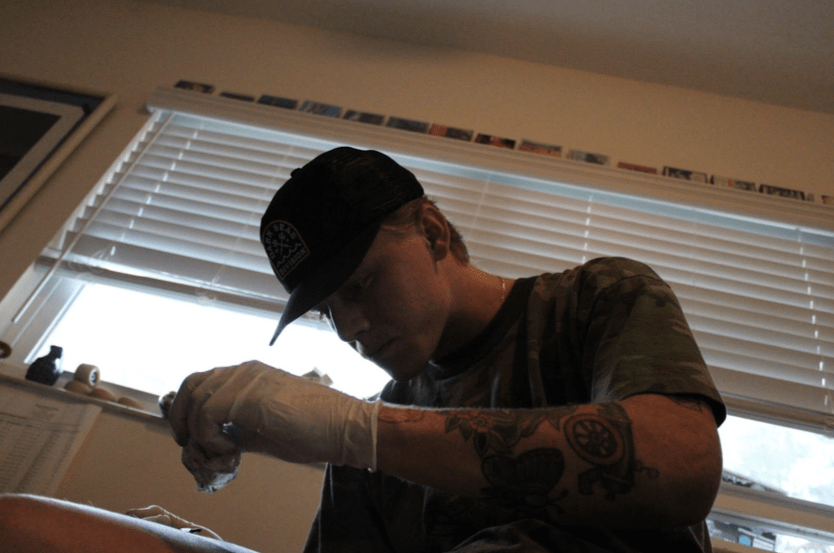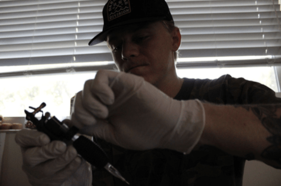 (Canon Crovo) With ink running down his leg, Canon firmly grasps the tattoo gun, to maintain control, and quickly wipes dripping ink with a paper towel. Canon has also gained inspiration for his art, when traveling up and down Florida skateboarding, surfing, and drawing to broaden his experiences, influences, and ideas.