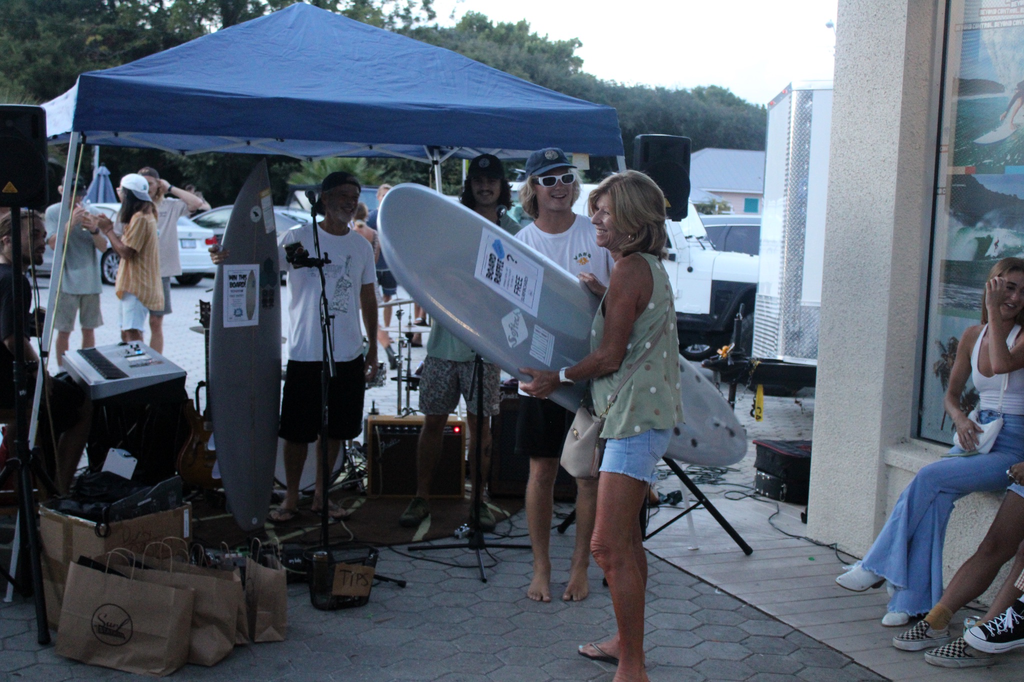 During the raffle, customers had the opportunity to win a new Channel Islands Bonzer surfboard and a new Softech Bomber soft top surfboard. Goodie bags, with leashes, traction pads, and more, were also given away to others who could answer trivia questions correctly.